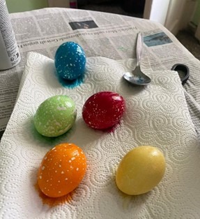 Als die Rasierschaumeier fertig waren haben wir sie abgespült und in die Eierpacken gelegt und haben aufgeräumt. Als die Glitzereier fertiggekocht waren, haben wir sie auf dem Balkon gestellt und 24 h stehen gelassen. 24 h später waren die Eier fertig und sind richtig schön geworden. Am Ende waren die Ostereier fertig.