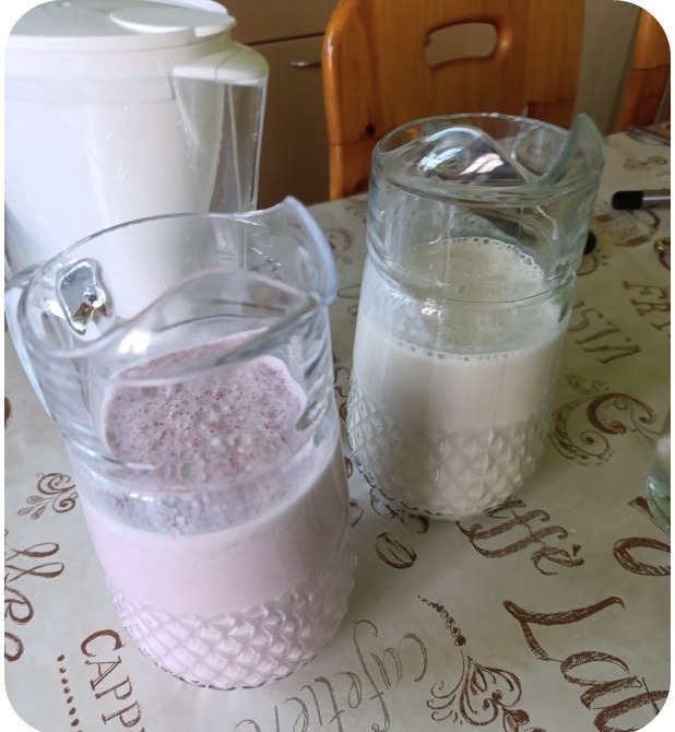 Während das Essen im Ofen war, fing ich an, zwei verschiedene Milchshakes selber zu machen. Einen mit Erdbeeren und einen mit Bananen. Die waren sehr lecker und gesund. Es hat allen so gut geschmeckt, dass alles alle war.